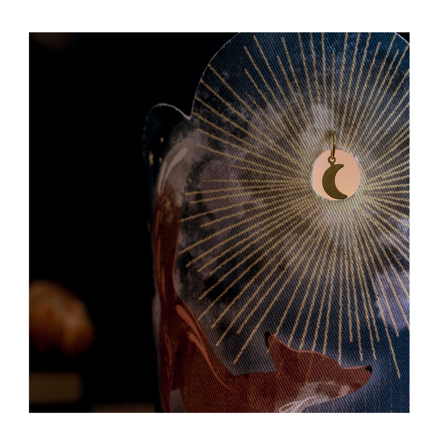 A playful fox bounds beneath a starry night sky, his red fur and white paws prancing on the soft green grasses as a shining moon overhead gleams. The original watercolour design has a small cutout section in the middle of the shining celestial design, with a dangling brass moon-shaped charm hanging within.