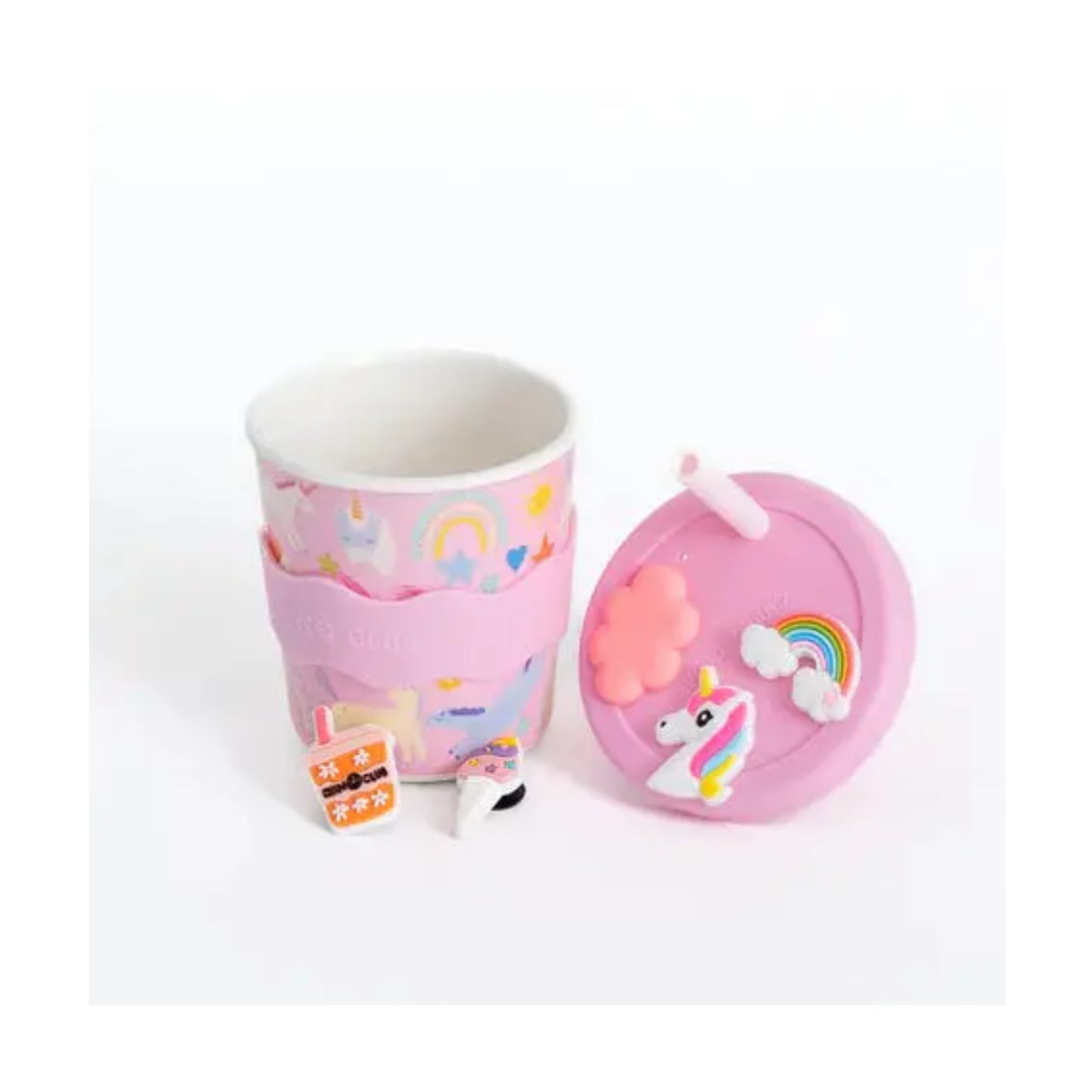 This unicorn design cup comes with a silicone lid and grip, matching straw and 5 playful charms, all complete in a cute gift box. A great eco-friendly alternative to disposable chino cups.