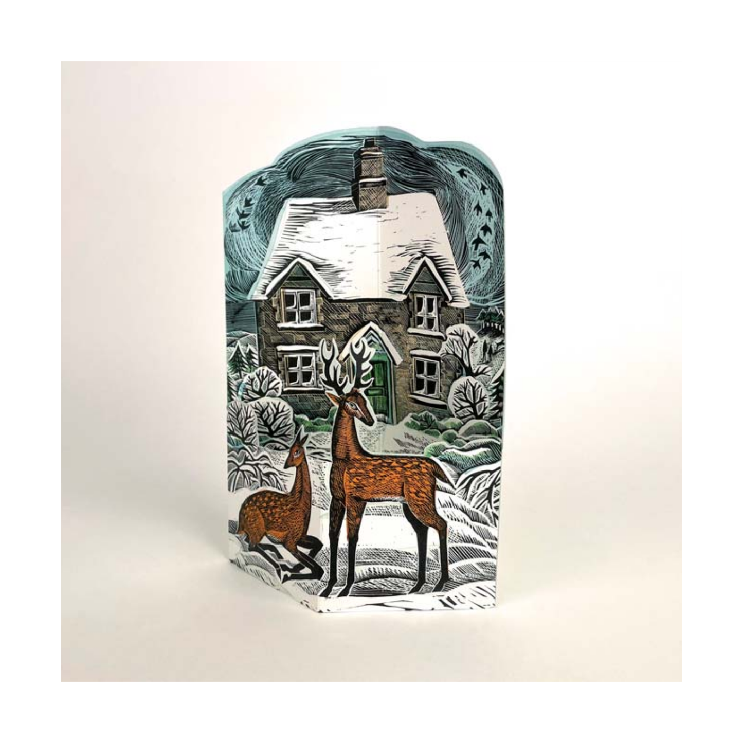 A beautiful illustration of a winter scene with deer, carefully designed and crafted into a die cut, fold-out card. Created by Angela Harding, this fold-out card might be the best way to send the perfect greeting.