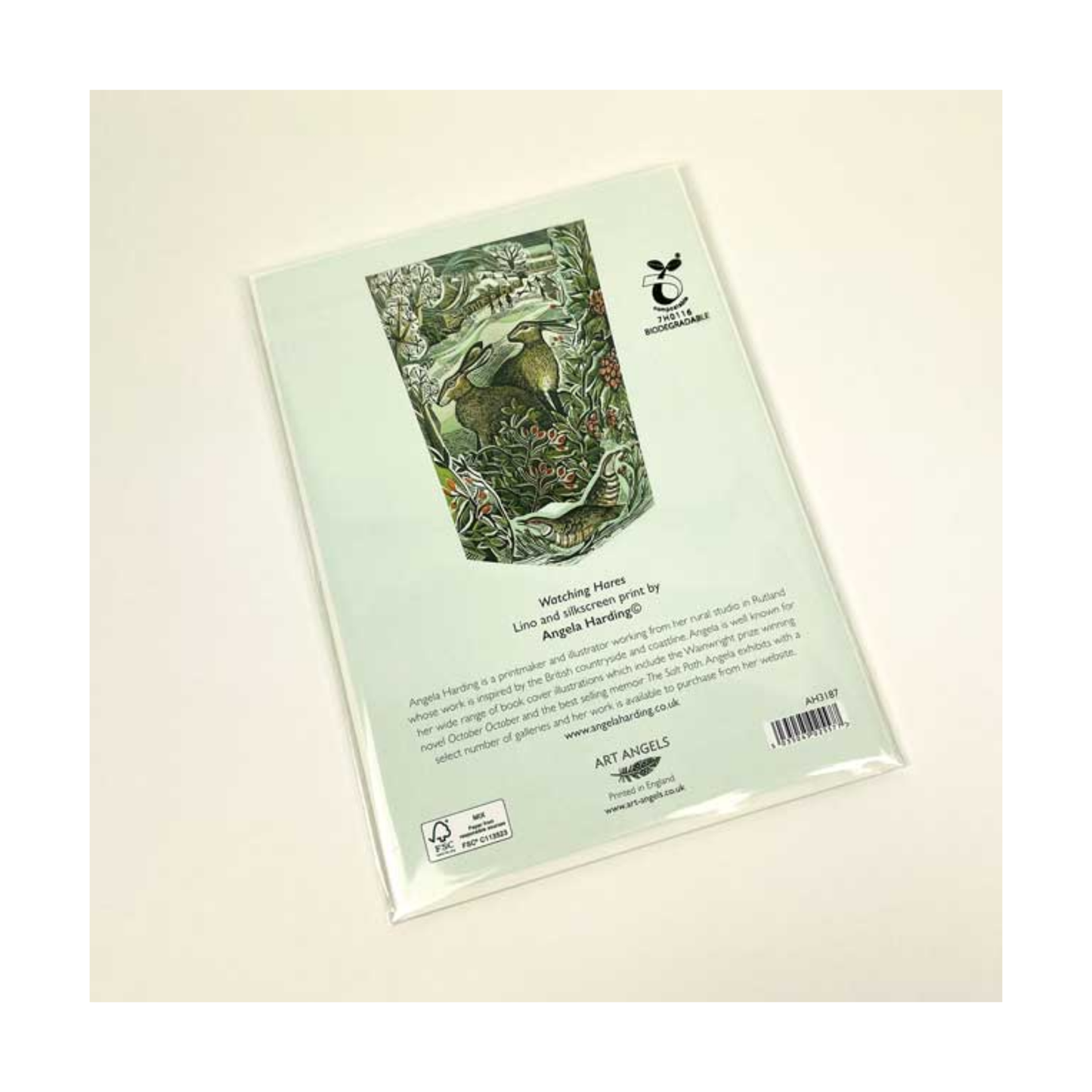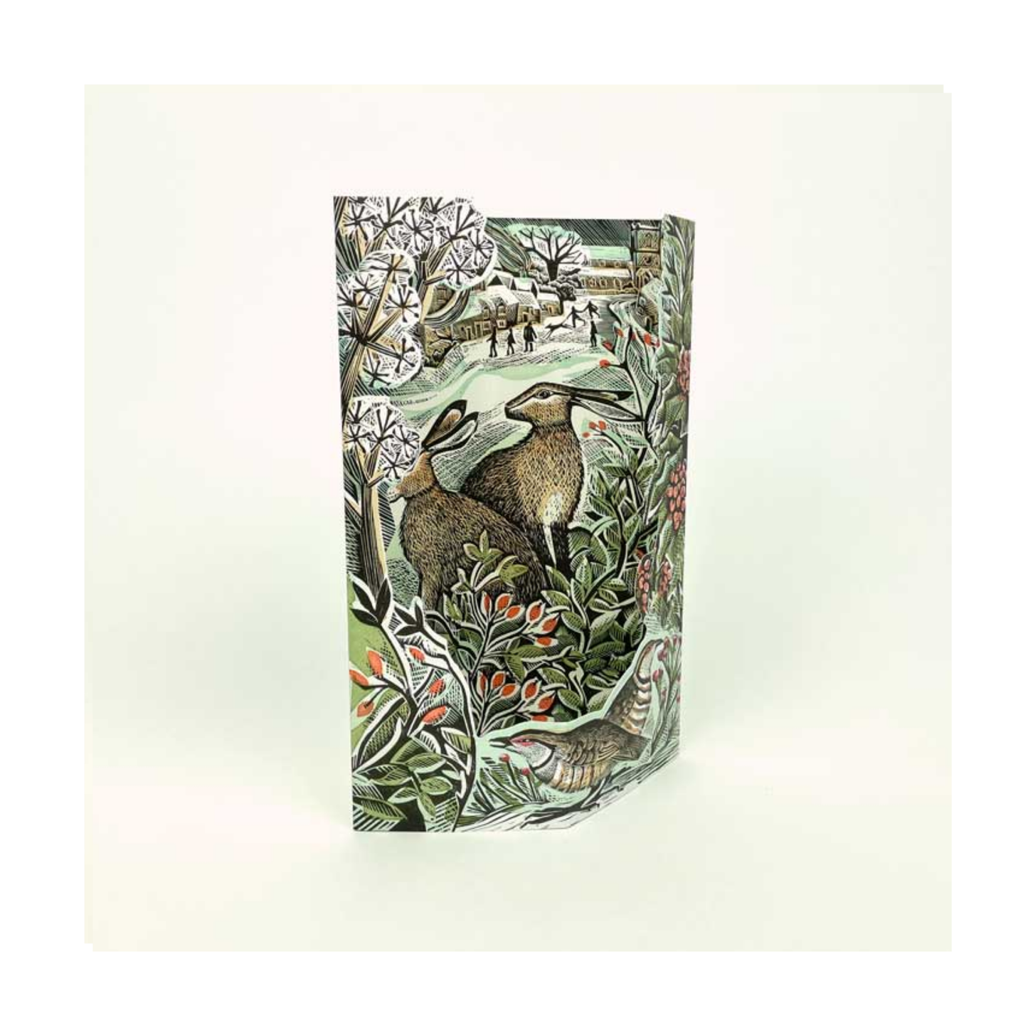 A beautiful illustration of a winter scene with hares, carefully designed and crafted into a die cut, fold-out card. Created by Angela Harding, this fold-out card might be the best way to send the perfect greeting.