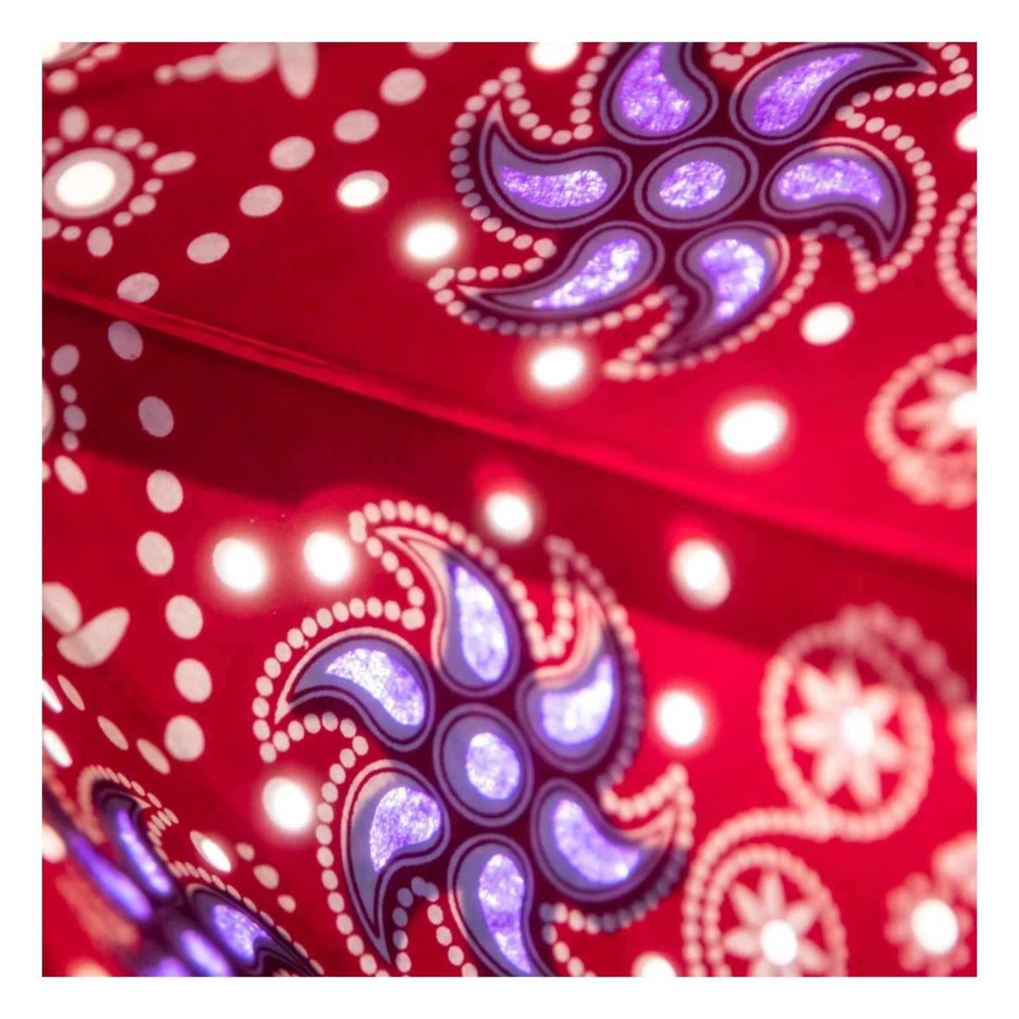 Create your own party ready atmosphere with this Firework Red Paper Star Lantern. With a scarlet base, lively screen printed detail, and atmospheric stained-glass effect, this handmade decorative star light is full of dramatic sparkle, vibrancy and colour. Tissue paper inserts in violet and blue glow against a bright red background; over 1000 tiny perforations create a captivating twinkle, creating atmosphere in any space.