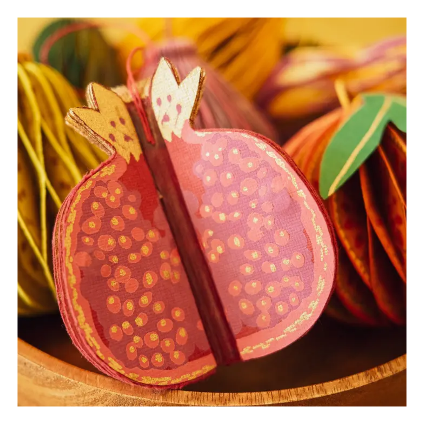 Delight your guests and celebrate with this rich Pomegranate Honeycomb Ornament by East End Press! Composed of intricate layers of recycled cotton paper, each decoration unfolds to reveal a three-dimensional honeycomb Pomegranate.