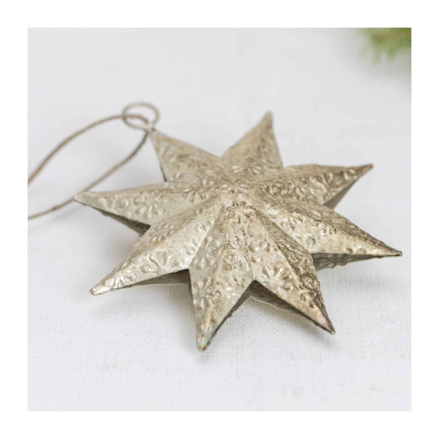 Crafted in a star shape, it features a beautifully hammered snowflake design. The silver effect finish lends an elegant shine, making it a perfect addition to your holiday celebrations. Ideal for hanging on your Christmas tree or as part of a seasonal display, this decoration will bring a sparkle to your festive décor.