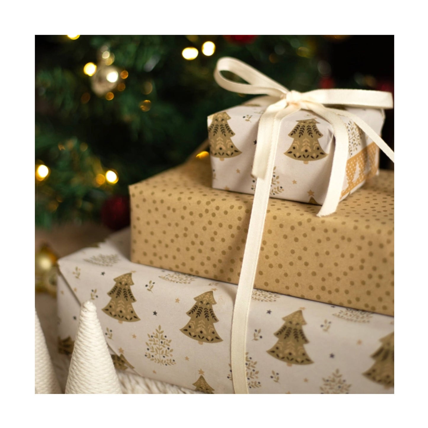 A 5m roll of gold Christmas tree-printed, recycled kraft wrapping paper from Cascayde. This Gold Trees Wrapping Paper Roll is sustainably sourced and fully recyclable, thin enough to fold beautifully and thick enough to protect all your parcels.