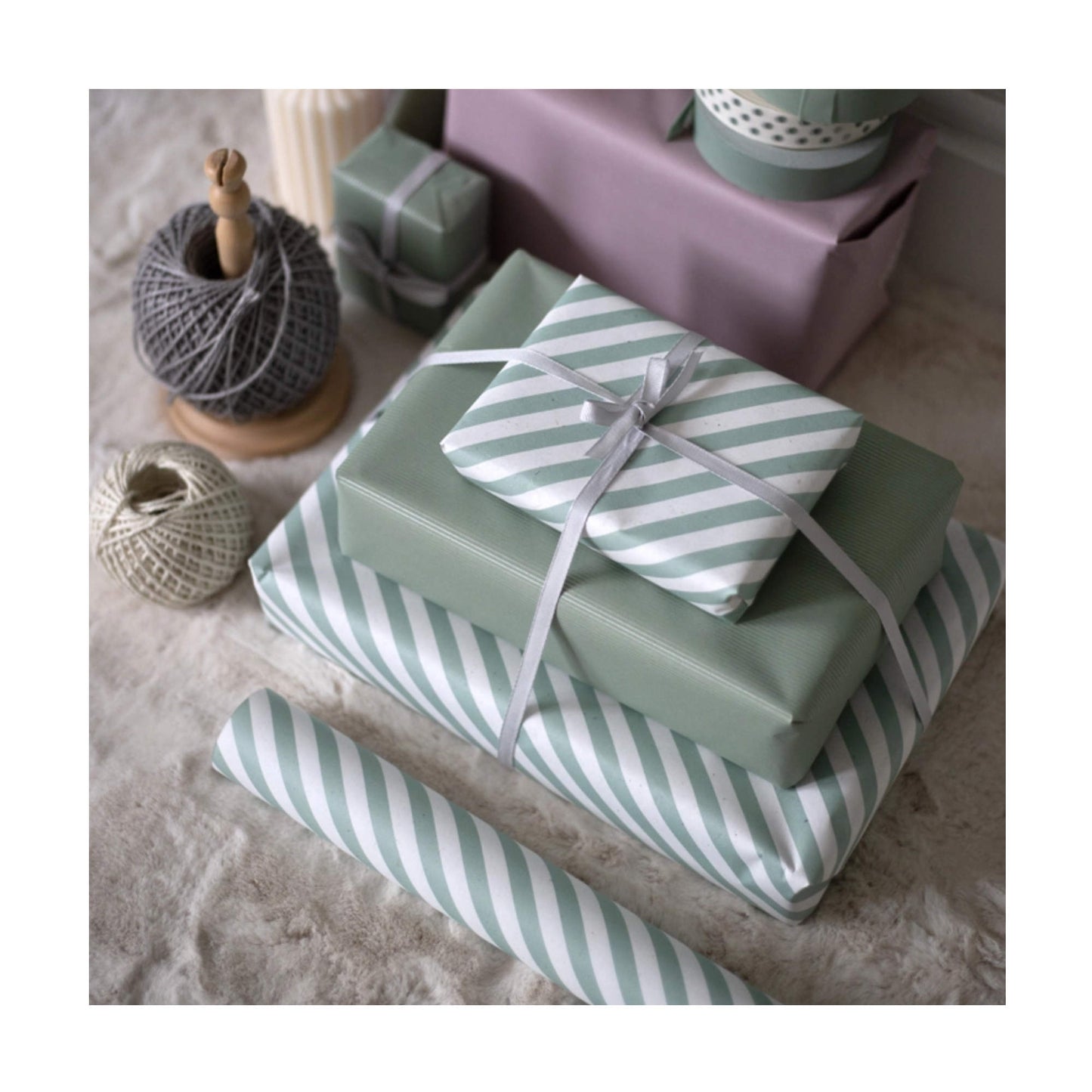 Design: Soft sage green stripes across white kraft paper, white on the reverse