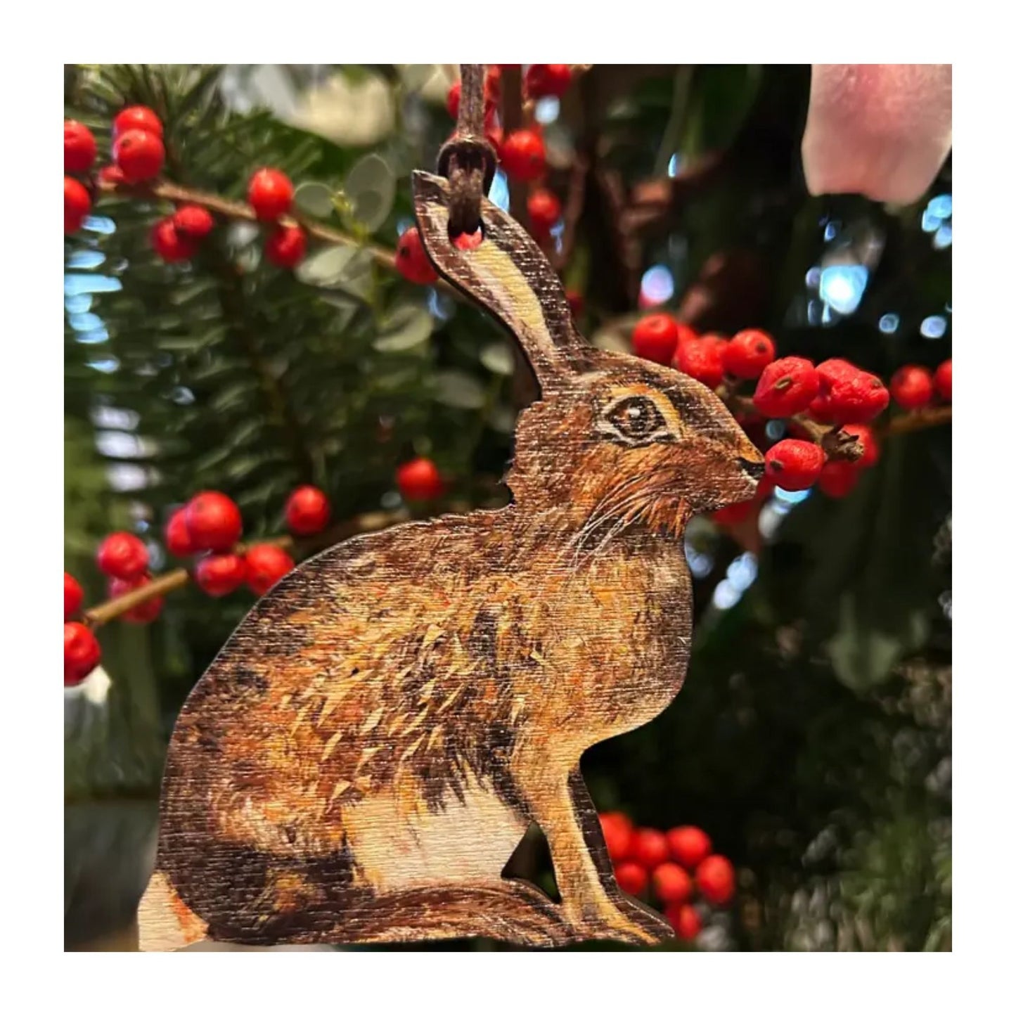 Each sitting brown hare Wooden Decoration has been printed and laser cut onto sustainably sourced birch plywood. Each brown hare Wooden Decoration has a waxed brown twine attached with a printed Kraft tag.