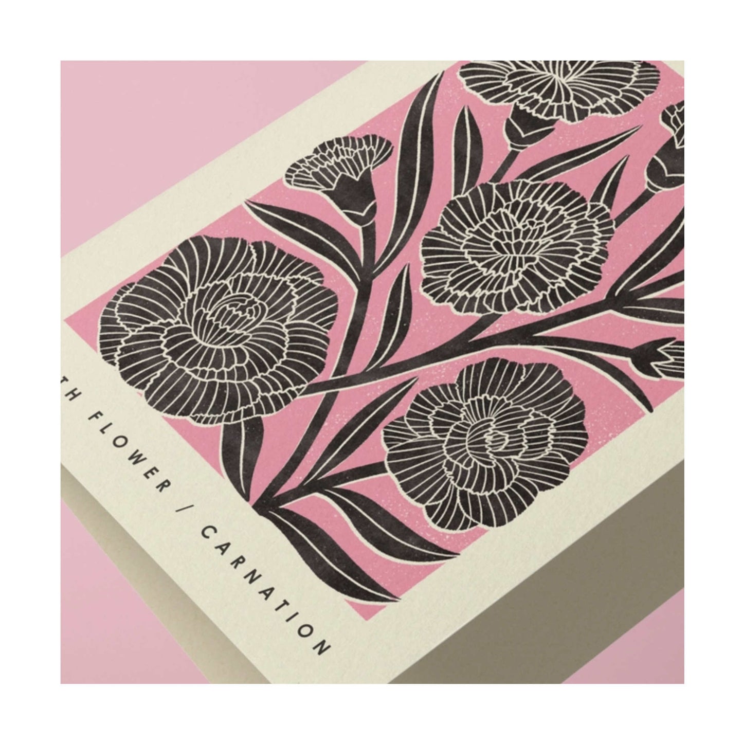 A stunning, illustrated birthday card from Bird & Co, featuring Carnations, January's birth flower. This eco-friendly art card is designed to last longer and be reused. Printed inside so the recipient can cut out and reuse as a postcard.