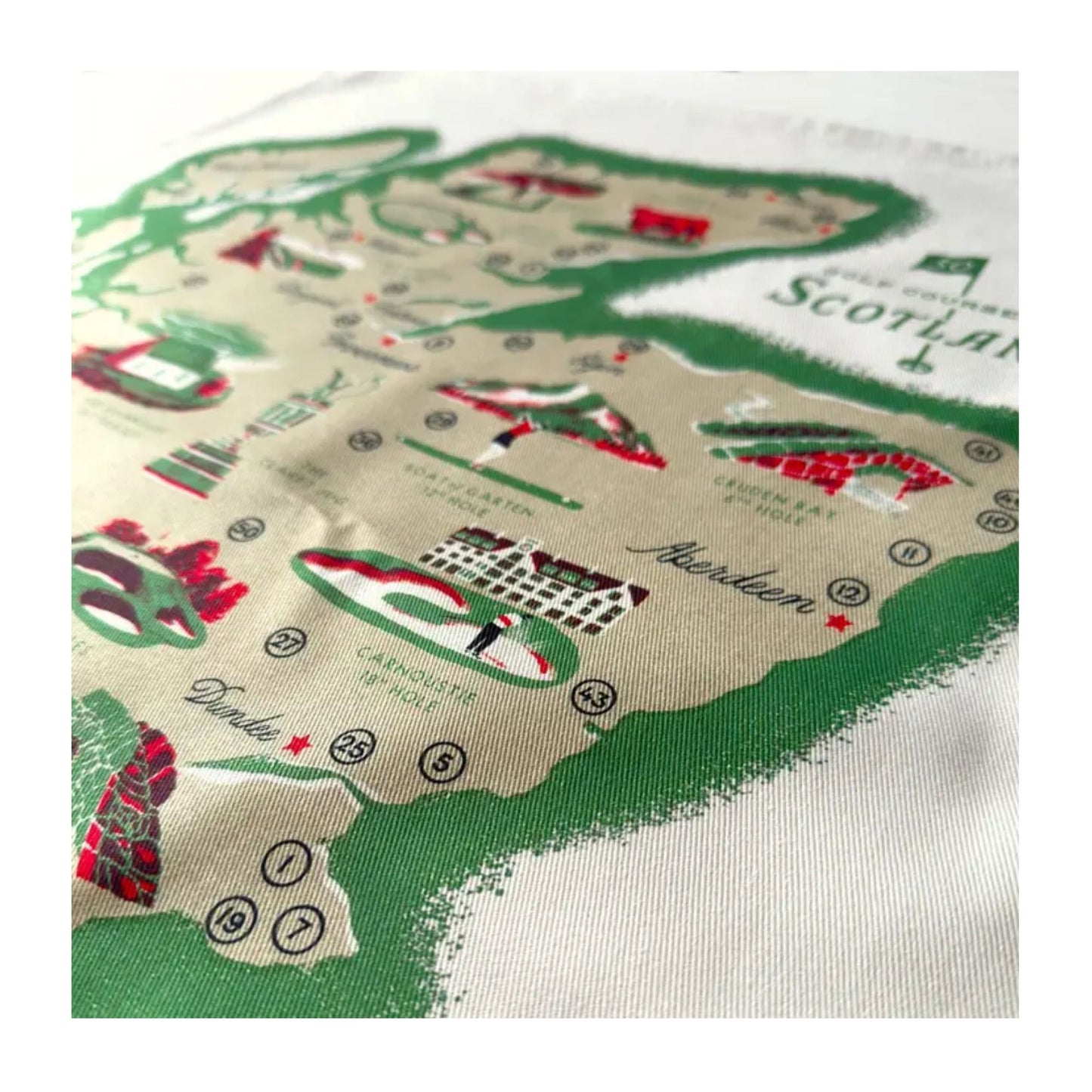 An illustrated Golf Courses of Scotland Tea Towel from Oldfield Design Co. celebrating Scotland's beautiful golf courses.