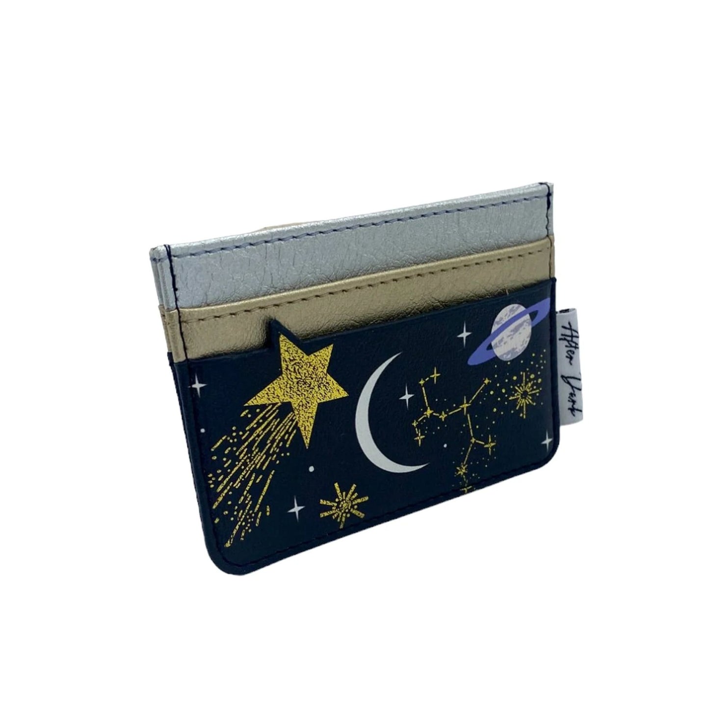 A cosmic and sophisticated After Dark Card Holder from House of Disaster. Treat yourself to a touch of cosmic elegance with this gorgeous metallic cardholder. Printed with illustrated stars and planets, this little accessory is as magical as the treasures it holds.