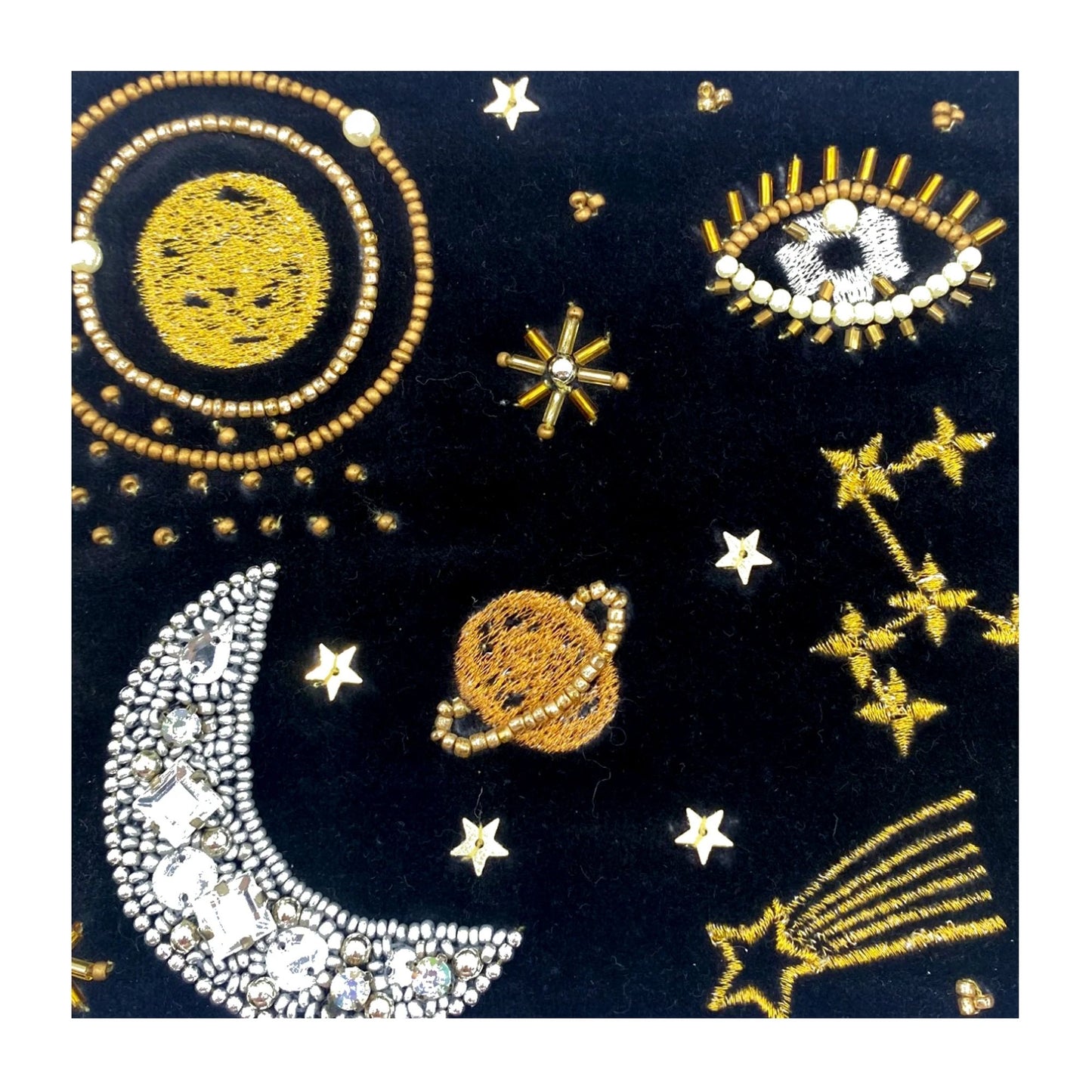 A cosmic After Dark Make-Up Bag from House of Disaster. Treat yourself to a touch of cosmic elegance with this gorgeous makeup bag. Adorned with carefully beaded stars and planets, this zip-up bag is as magical as the treasures it holds