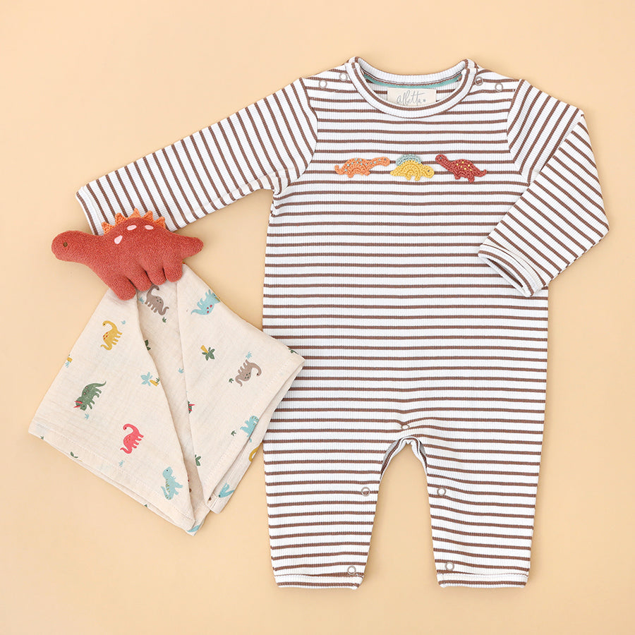 This adorable Dino Comforter by Albetta is the perfect cuddly companion for any little one at bedtime. Made from acute dinosaur print featuring dinosaurs and prehistoric plants in fun, modern colours on a super soft, organic cotton gauze.