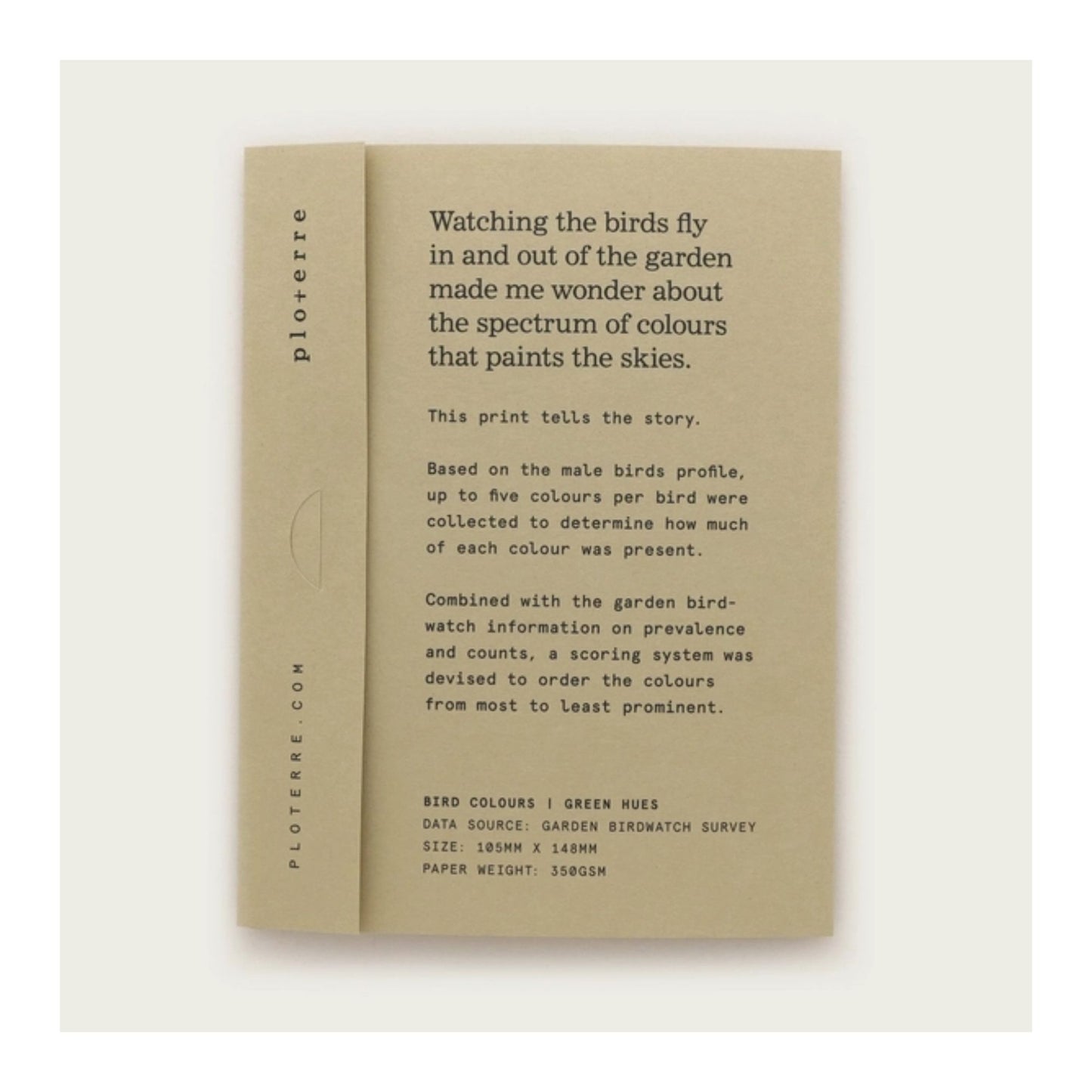 A beautifully unique print from Ploterre that uses data to create artwork. This Green Bird Hues Smallprint is inspired by watching the birds fly into the garden and the spectrum of colours that paints the skies.