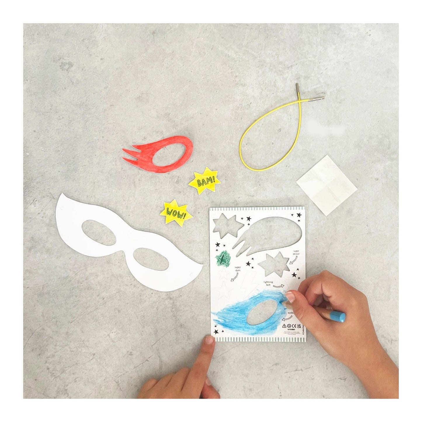 Children can use the mask base & cut-outs to embellish their masks and create their favourite superhero mask. Colour in your mask & accessories, attaching them with the glue dots, then it's time to show family & friends your special powers!