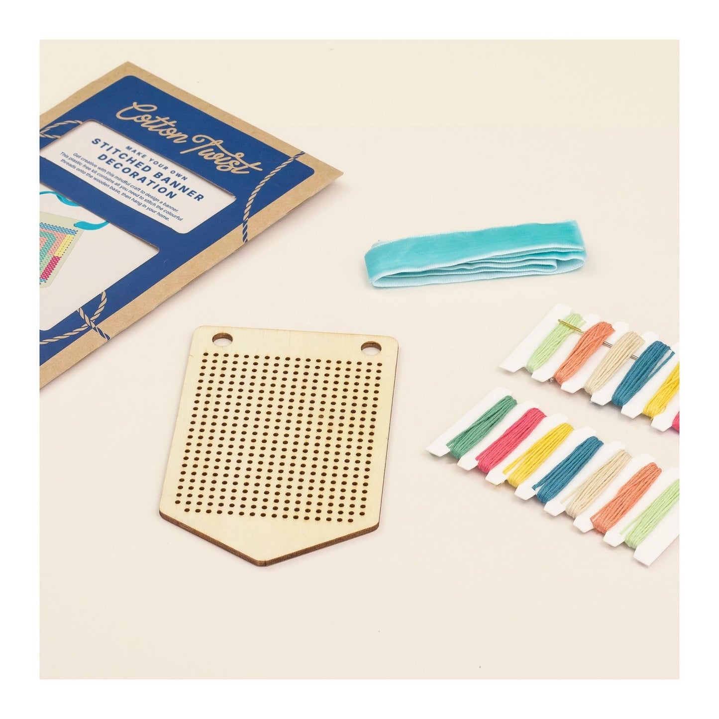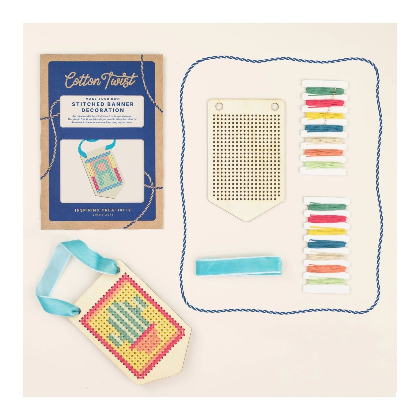 A fun and creative craft kit for kids from Cotton Twist. This Stitched Banner Decoration Kit is the perfect way to add a personal touch to any room! This fun and creative kit allows you to design your very own door hanger, all while enhancing your stitching skills.
