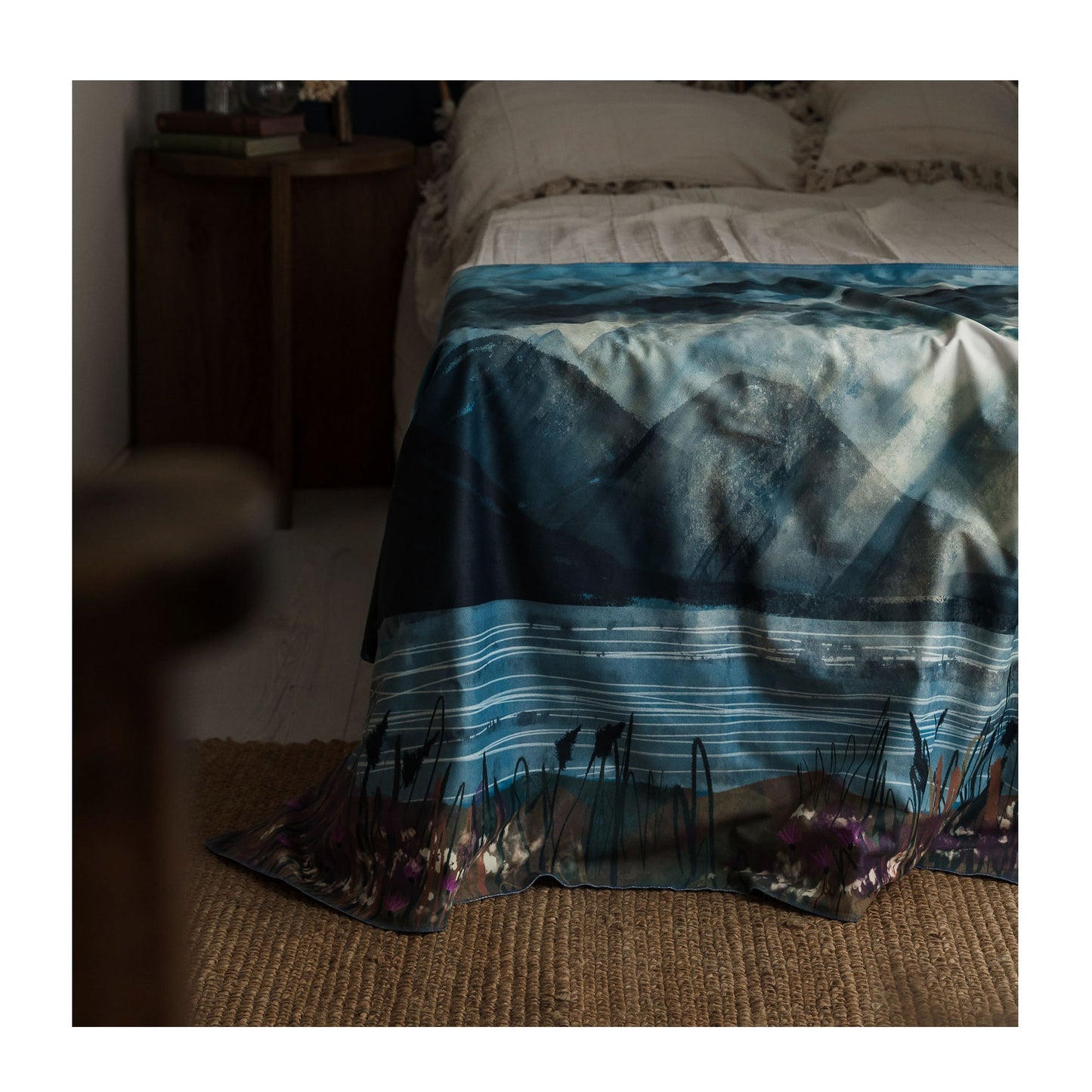 The cloud crowd overhead, fighting for dominance across the wide Scottish skies. Yet, the sun breaks through, creating god rays of sunshine that reveal the beauty of the landscape - a calming yet invigorating experience that has been captured in our Through The Clouds design, part of our Big Sky collection.