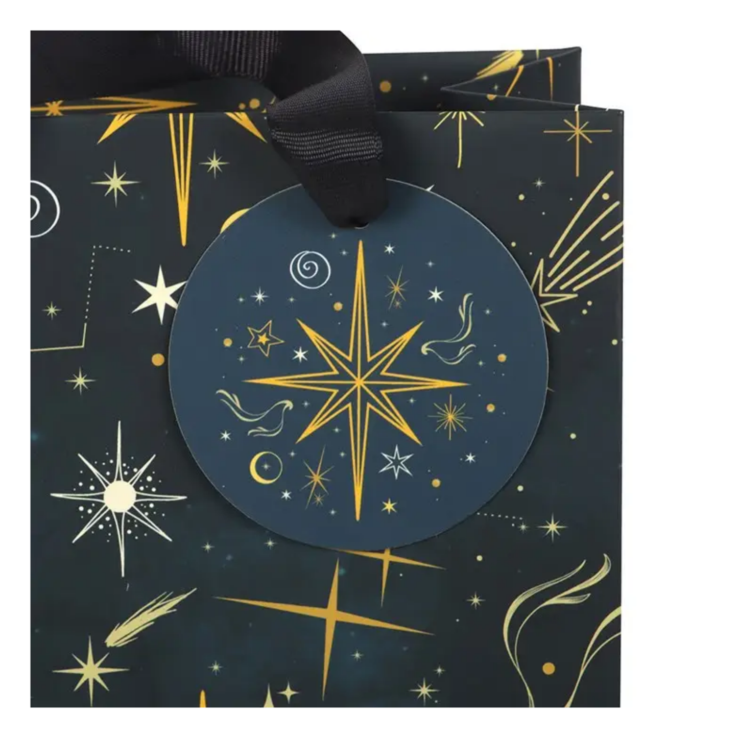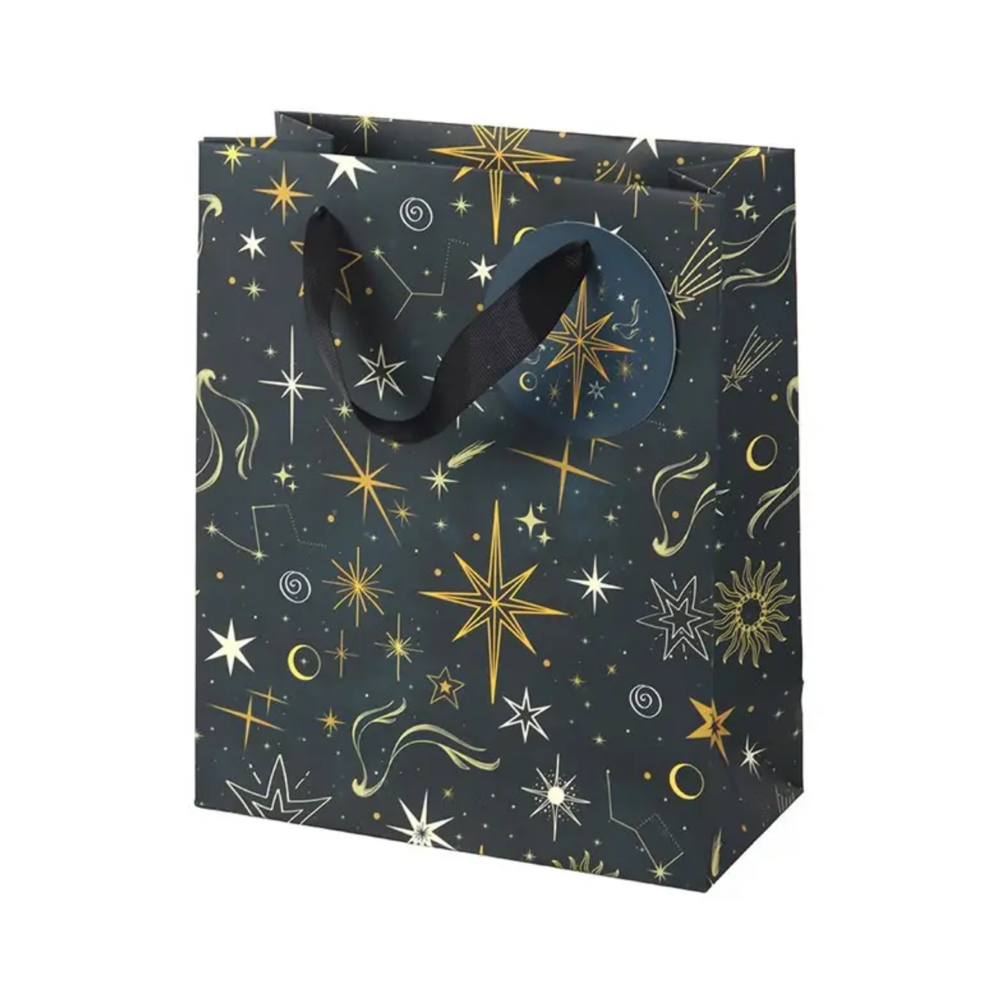 Make gifting extra special with this enchanting Starry Night Celestial Gift Bag. Decorated with golden stars against a deep navy background, this medium-sized bag adds a touch of festive magic to presents big and small.