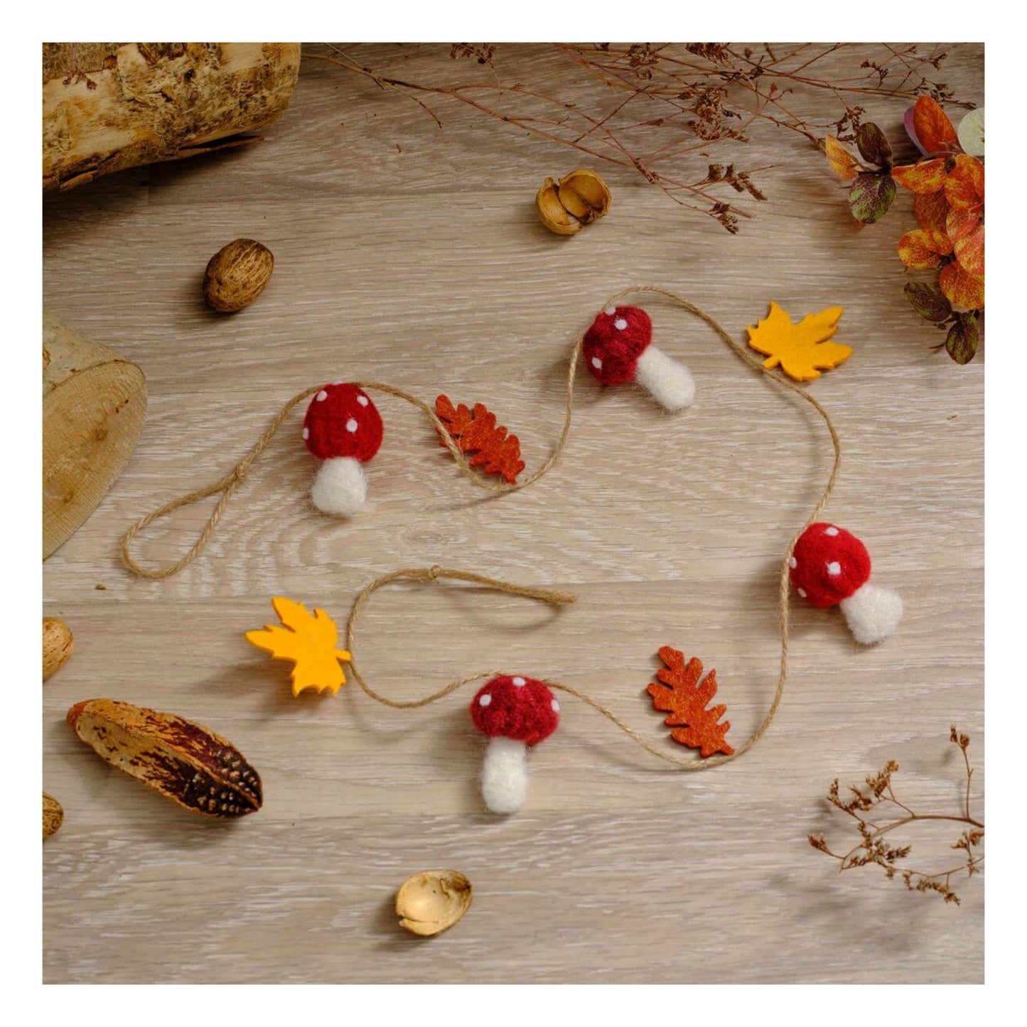 Contains multiple felt mushrooms and leaves evenly spaced along the string.
